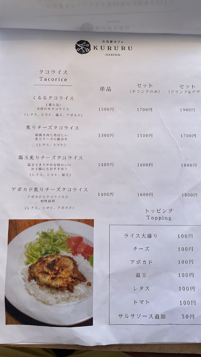 Welcome to 古民家カフェくるる -NAKIJIN-, a charming cafe nestled in the tranquil backroads of Nakijin, Okinawa. This rustic gem invites you to savor one of Okinawa's signature dishes: the タコライス (Taco Rice). Expertly crafted, their popular くるるタコライス is a delightful blend of fresh lettuce, succulent tomatoes, a warm egg, and avocado, making it a must-try for any food lover.